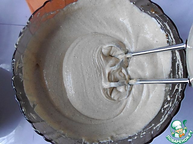 Тем временем займемся суфле. Варим очень крепкий кофе любым удобным для Вас образом и отмеряем 70 мл. Охлаждаем и насыпаем в него желатин. Оставляем на нужное для его набухания время. Творог, мягкий сыр, сахар и ванилин взбиваем в миске до получения однородной консистенции. Творог лучше всего подойдет некислый и пастообразный. Если же все-таки в Вашем твороге есть крупинки, протрите его сквозь сито, и только затем смешивайте с остальными компонентами.