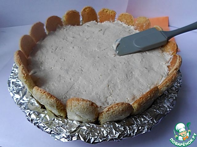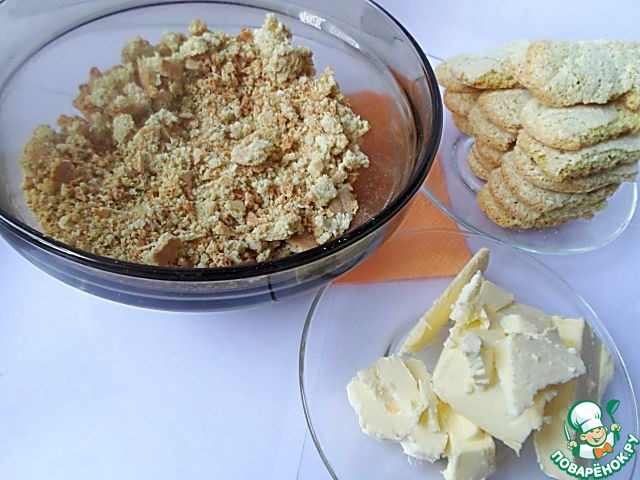 Сначала приготовим основу для торта. 9 печений аккуратно разламываем пополам на 18 частей и откладывам в сторону - ими мы будем выкладывать стенки торта. Оставшееся печенье кладем в целлофановый пакет и давим его в крошку при помощи скалки. Я использовала круглую форму диаметром 18 см и мне вполне хватило 18 половинок, чтобы они образовали круг без пробелов. Но имейте ввиду, что я использовала не магазинное савоярди и не могу сказать точно, сколько потребуется магазинного. Поэтому я бы посоветовала, перед тем как измельчать печенье, убедиться, достаточно ли будет для Вашей формы 18 частей, или просто оставьте про запас несколько штук на всякий случай, чтобы точно хватило.