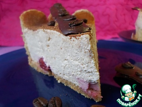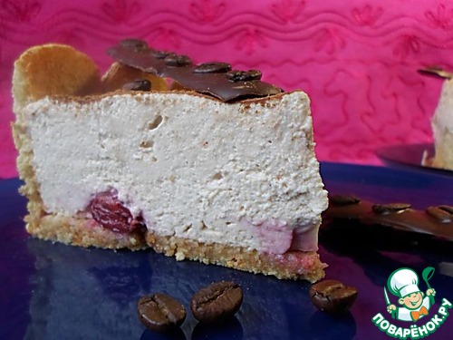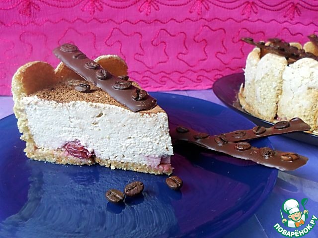 На вишню выкладываем ровным слоем кофейно-сливочное суфле. Делаем это аккуратно, чтобы не упали половинки печенья по бокам.
