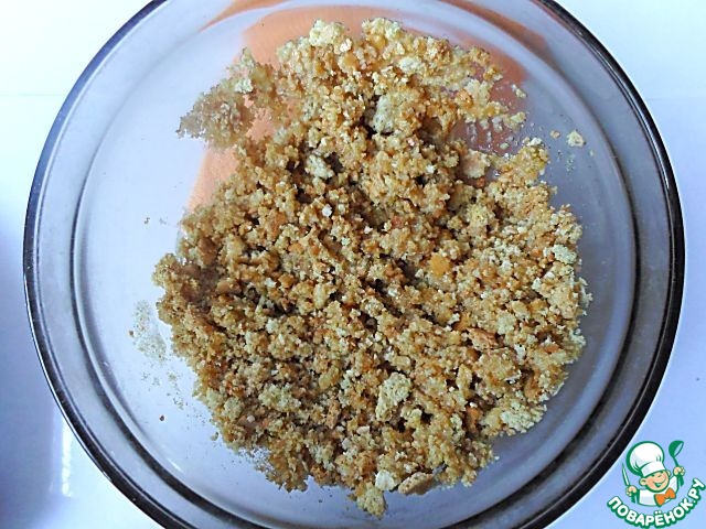 Растапливаем на тихом огне сливочное масло, кипятить его не надо. Заливаем растопленным маслом бисквитную крошку и тщательно перемешиваем.