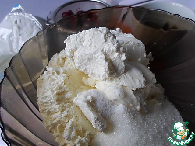 Взбиваем в отдельной мисочке охлажденные сливки до устойчивой пены. Начинаем взбивать на слабой скорости, потихоньку повышая, чтобы их не засечь.
