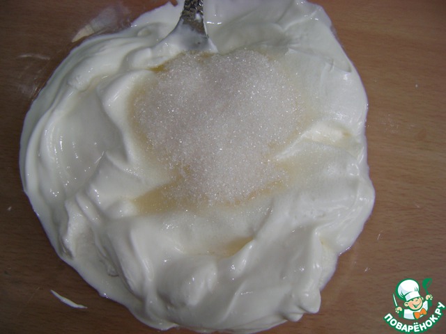 Пока желатин остывает, взбиваем сметану с сахаром.