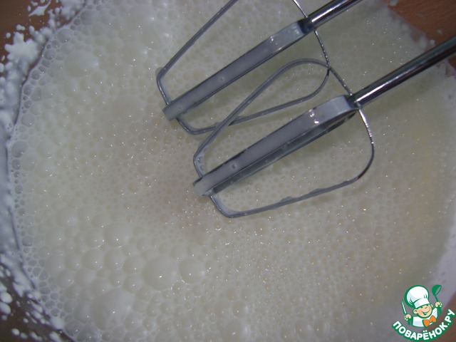 Смесь желатина вливаем в сахарно-сметанный крем, продолжая все взбивать.