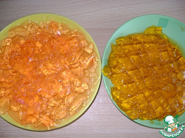 Каждое блюдце с готовым желе надо опустить в емкость с горячей водой на 20-30 секунд и перевернуть на тарелку. Осторожно извлечь его и нарезать произвольными кусочками.