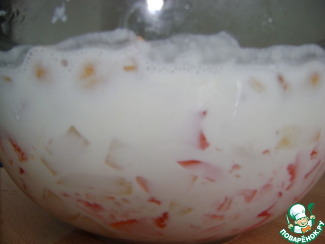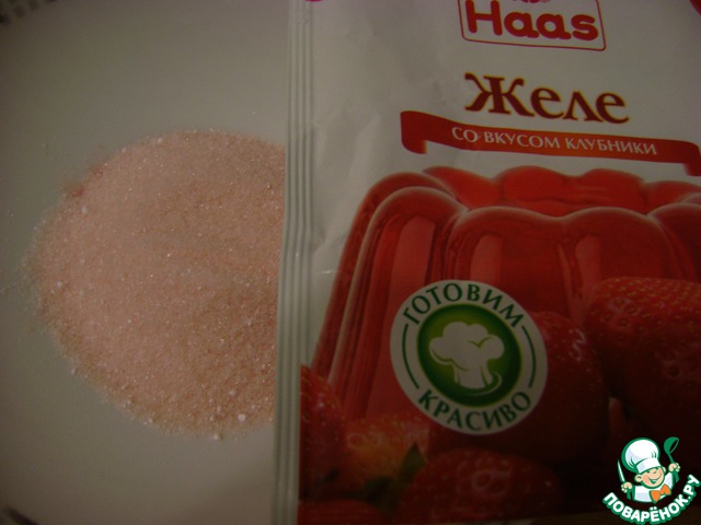Для торта взяла два вида желе-со вкусом персика и клубники. Можно еще добавить киви, чтобы цвет торта был разнообразнее (у меня не было). Чтобы приготовить желе, надо вскипятить воду. В блюдо с желе влить 250 мл кипяченой горячей воды и тщательно перемешать до полного растворения.