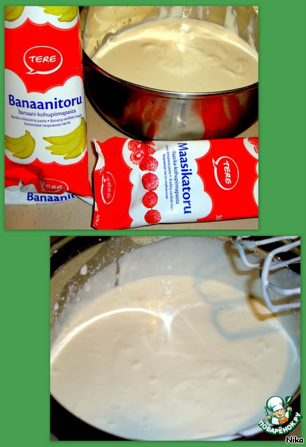 Для крема банановая и клубничная творожная масса, и жирные сливки.