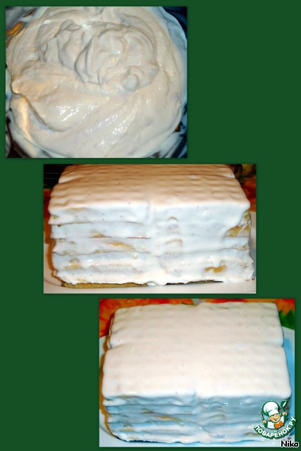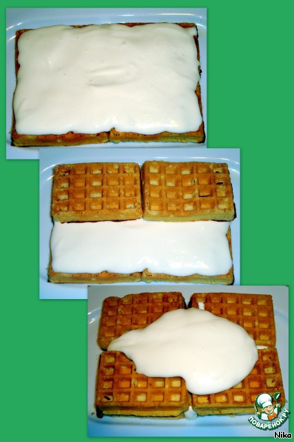 Выложила по четыре вафли в ряд. Каждый ряд густо обмазала взбитой массой.