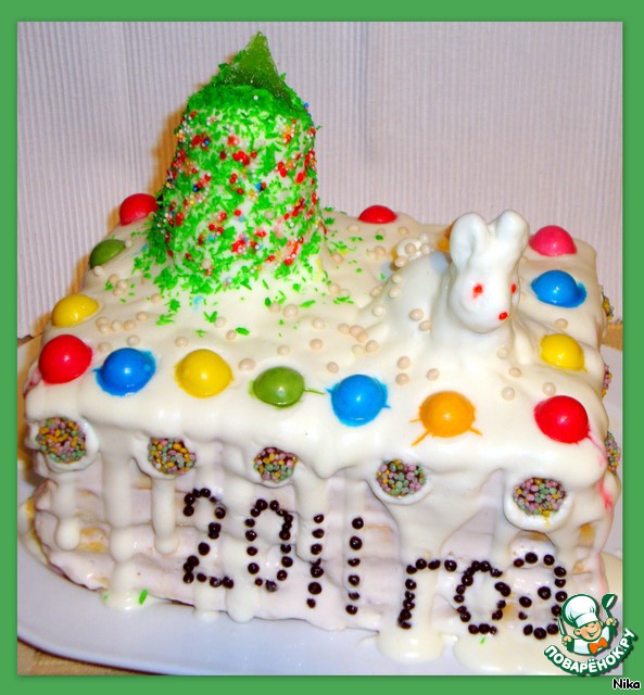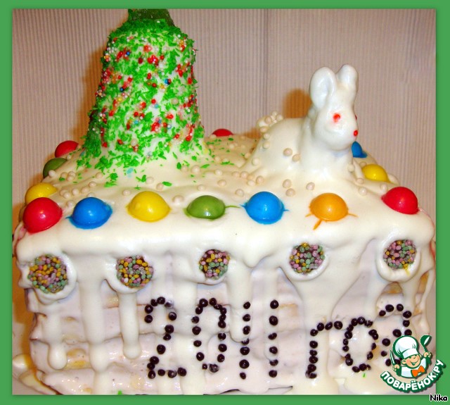 Основа торта готова. Дело осталось за украшением. Я задумала ёлочку и зайца, но не знала, из чего их сделать. Пошла на рынок (он через дом от меня) и купила не нарезанный батон.