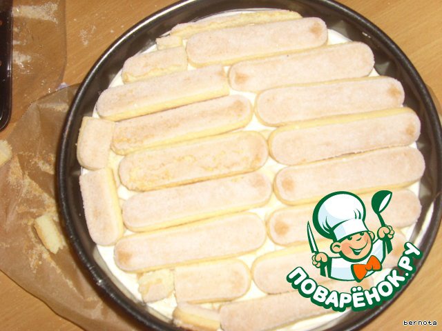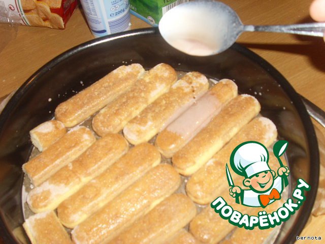 Затем ещё слой бисквитных печенюшек, поливаем какао-молочным напитком и покрываем оставшимся кремом.
