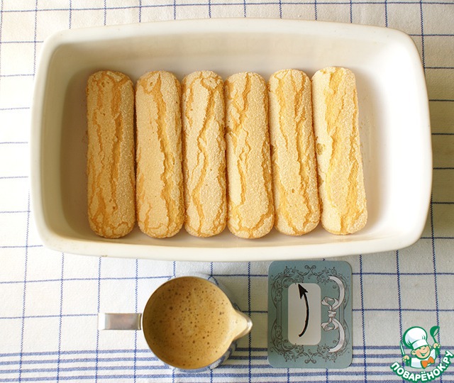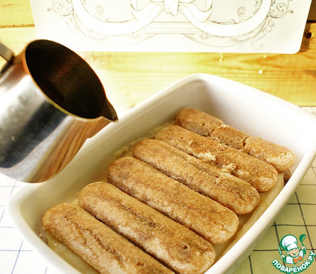 Варим крепкий эспрессо (делаем двойную забивку рожка). Печенье (в нашем случае савоярди или любое постное, какое найдете в магазине) укладываем в форму и пропитываем кофе.