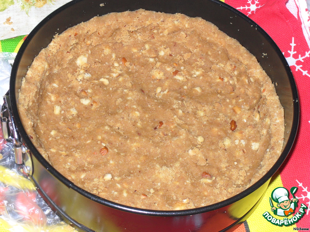 Заранее заливаем желатин теплой кипяченой водой и оставляем набухать. Миндаль обжариваем на сухой сковороде до появления золотистых бочков. Измельчаем его. Измельчаем в крошку печенье (я просто положила печенье в пакет и растолкла скалкой), можно воспользоваться блендером или мясорубкой. Добавляем размягченное масло, смешанное со сгущенкой, и орешки. На дно формы укладываем лист пергамента или пищевой пленки (как у меня), смазываем растительным маслом бока формы и дно. Выкладываем полученное "тесто" в форму и утрамбовываем, делаем бортики. Ставим в холодильник застывать.