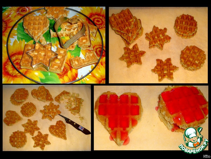 Из вафель вырезала 12 фигурок, по четыре одинаковых. Пирожное составляла из двух частей. Нижнюю густо смазала киселём. В готовый густой кисель добавила растворенный в воде желатин.