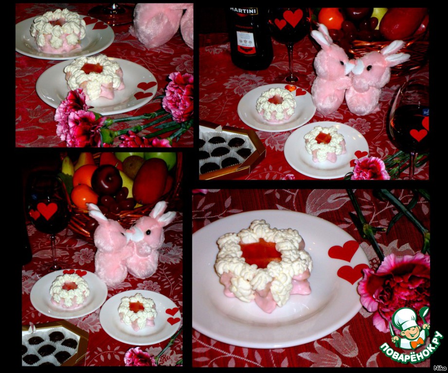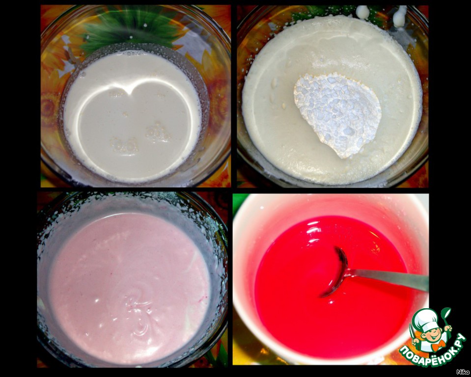 Жирные сливки. Взбила сливки с сахарной пудрой. В одну часть готовых сливок добавила для цвета сухой вишнёвый кисель и желатин. Кисель для пропитки пирожного. Туда тоже добавила желатин. Нижнюю и верхнюю части густо смазала киселём и соединила. Взбитыми подкрашенными сливками обмазала бока пирожных. Сливки белого цвета положила в кондитерский мешочек и украсила верхнюю часть пирожных.