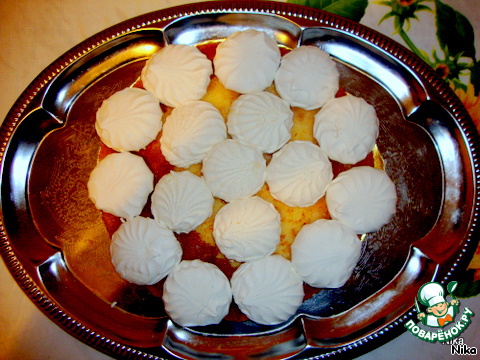 На бисквит выложить зефир. Все три бисквита предварительно пропитать сиропом