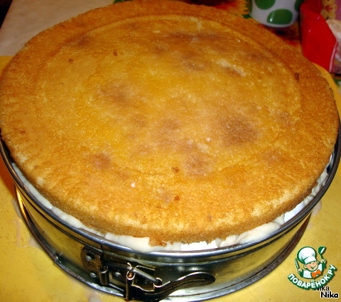 Первый ряд накрываем вторым бисквитом, выкладываем зефир и крем из творога (взбитый вместе с двумя ложками сметаны и одной третьей частью желатина)