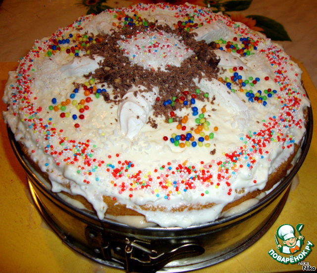 | Торт для сладкоежек. Бисквит, зефир, желатин, творог... Много не съешь. Торт на любителя. Сахара только две столовые ложки сверху в сливочном креме. Почему так назвала этот торт... Он очень сладкий за счeт зефира. Разрезать на кусочки его весело, так как он без выпечки, а с желатином не очень хорошо режется. |