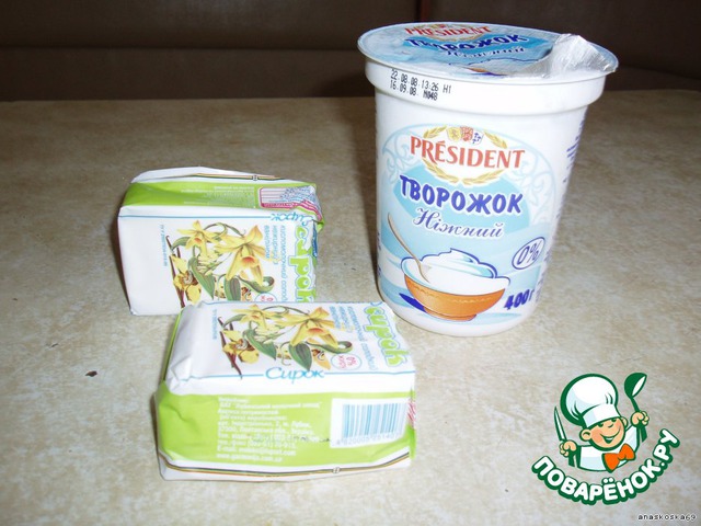 Смешать творожки. Отдельно взбить сливки с сахаром и ванилью. Добавить распущенный желатин.