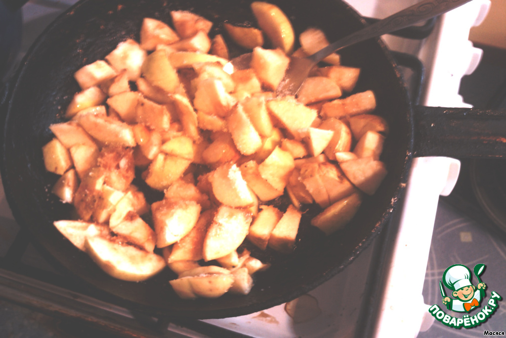 Теперь займемся яблоками. Режем крупно и на сливочном масле тушим с сахаром минут 5.