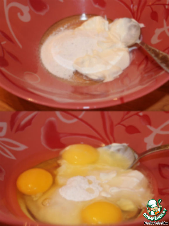 Смешиваем сметану и сахар. Добавляем яйца и все хорошо размешиваем.