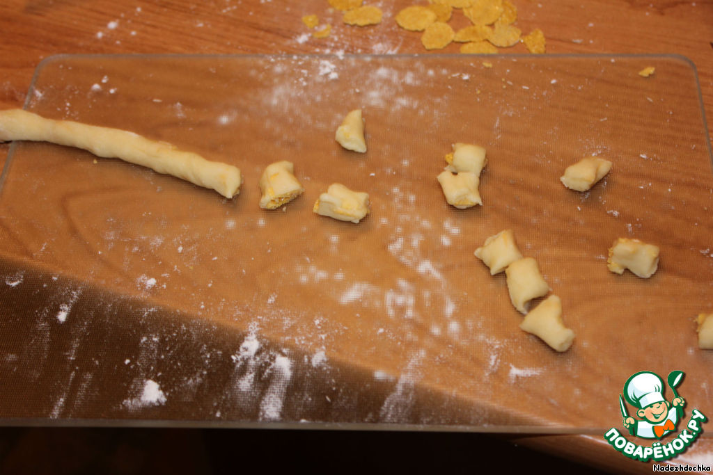 Теперь из теста катаем тонкие "колбаски" и режем на небольшие кусочки.