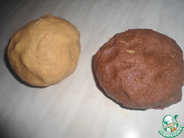 Печенье, типа "Юбилейного" смолоть в блендере до состояния крошки. Разделить на две части. Одну я сделала немного поменьше (это не обязательно, можно в равных пропорциях-не принципиально). Добавить в одну часть какао-порошок.