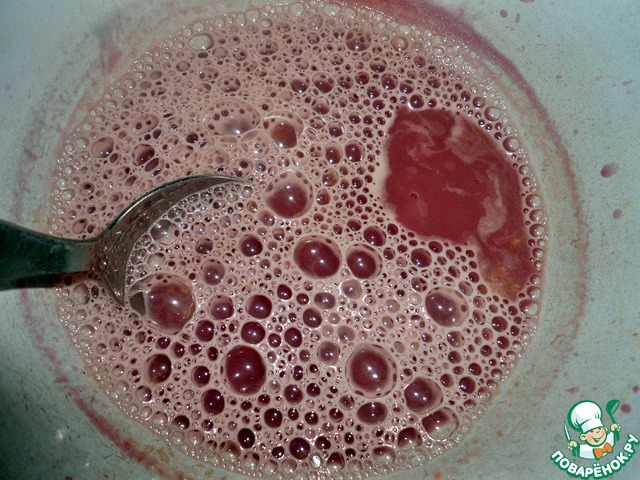 Теперь займемся кремом. Из этого будет сделана шуба деда мороза. В кастрюльку наливаем... и тут... что у вас имеется в красном виде (компот из черной смородины, из вишни, из винограда, из черноплодной рябины, либо сок такого оттенка)Я же использовала чай каркаде. Заварила очень крепко. Его мне понадобилось пол-кружки. Варим обычный кисель, только достаточно густой.