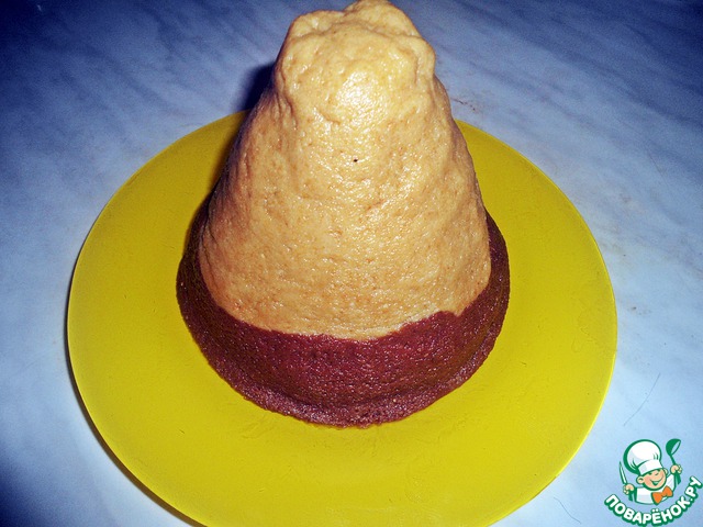 Достаем из холодильника наше "тесто", лепим из него форму конуса. Обратите внимание, темный слой внизу. Оставляем от него небольшой кусочек для глазок.
