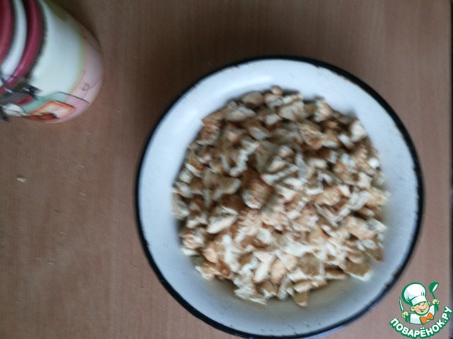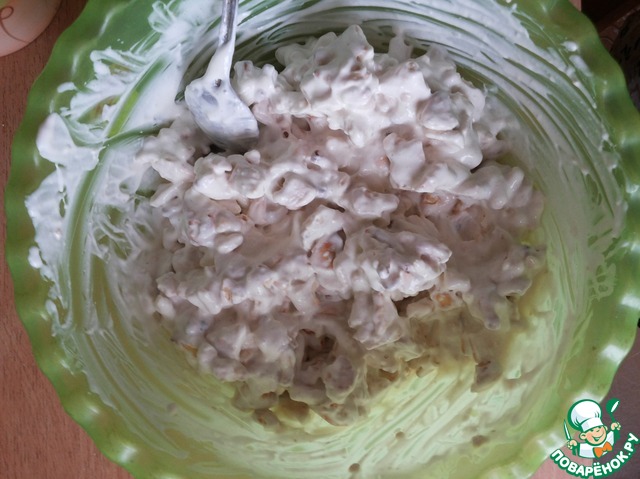 Соединяем сметану взбитую с сахаром с нашими крекерами, тщательно перемешиваем и убираем в холодильник минут на 10