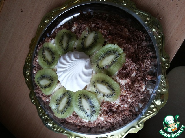 Дальше украшаем торт по своему желанию) Я положила в серединку половинку зефира, и украсила киви, а потом еще и шоколадку потерла на терке и украсила ее бока тортика)