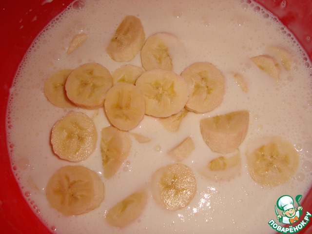 Бананы очищаем, нарезаем кружочками, добавляем в крем и перемешиваем.