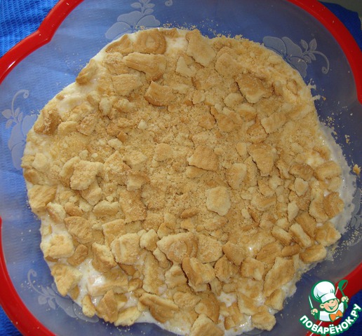 Засыпаем измельченным печеньем и ставим в холодильник для застывания на 5-6 часов.