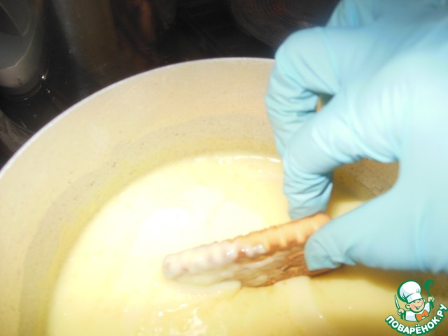 3. Далее уже в готовый пудинг (естественно, горячий) обмакиваем каждое печенье и выкладываем слои. (Я всегда работаю на кухне в специальных перчатках, поэтому руки у меня чистые, и конечно, это гигиенично).