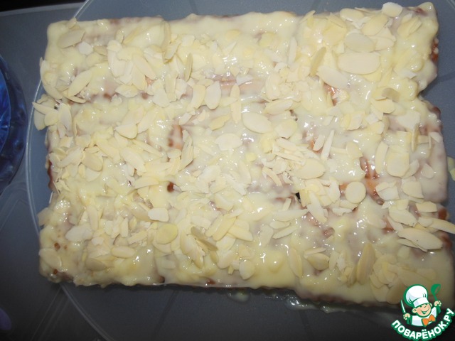5. Следующий слой так же ложится сверху на первый слой. Прослойка любая, по вашему усмотрению. У меня был резаный миндальный орех.