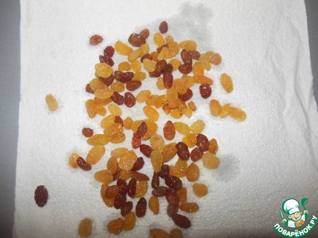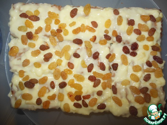 6. Третий слой также обмакиваете в креме (пудинг) и посыпаете изюмом. Естественно, Изюм предварительно промываем в горячей воде и высушиваем бумажным полотенцем.
