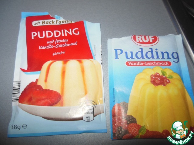 Для тех, кто не знает, как варить пудинг, пишу: берём 0.5 литров молока, добавляем пакет пудинга, хорошо размешиваем и ставим на огонь, добавляем 1 стакан сахара и доводим до кипения, постоянно помешивая пока не загустеет. (2-3 мин).