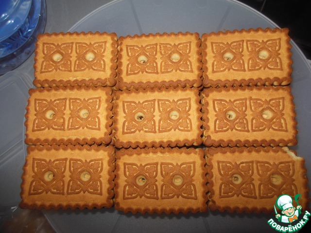 2. Берём печенье и выкладываем, чтобы определиться, сколько штук нам понадобится. Я делала на 1 кг печенья, и у меня получилось 4 коржа (назовём их так), в каждом корже по 9 штук печенья.