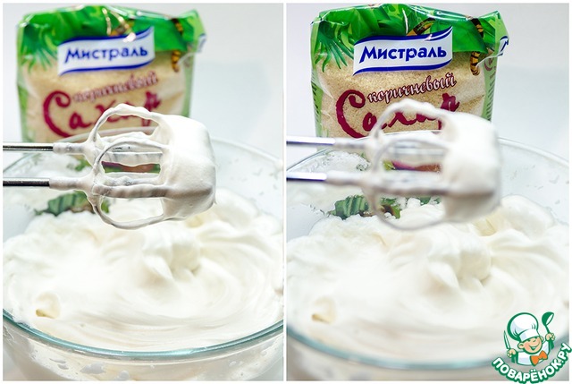 Сахар превратите в сахарную пудру при помощи кофемолки. Белки, отделив от желтков, взбейте в крепкую пену. Затем постепенно добавляйте сахарную пудру, по 1 столовой ложке, каждый раз взбивая, до полного её растворения.