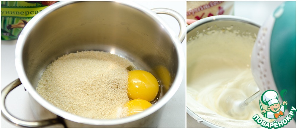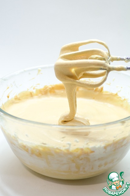 Желтки взбиваем с оставшимся сахаром (75г), до увеличения его в объеме и побеления.