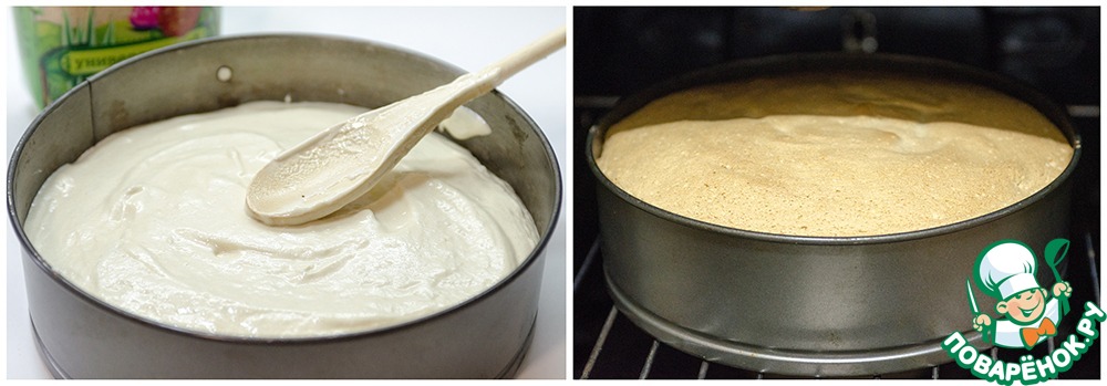 Дно формы для выпекания застелите фольгой или бумагой для выпечки. Выложите бисквитное тесто в форму и разровняйте его.