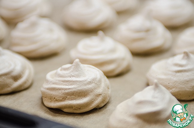 Противень застилаем пергаментом и, с помощью кондитерского шприца выдавливаем безе. Выпекаем безе при температуре 150С в течение 45-60 минут.