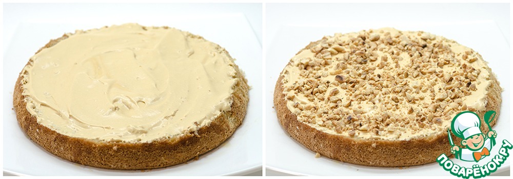 Щедро смазываем коржи кремом и посыпаем рубленным арахисом.
