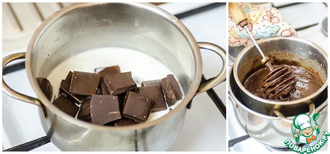 Сливки доводим до кипения, бросаем в них измельченный шоколад и ставим на водяную баню.