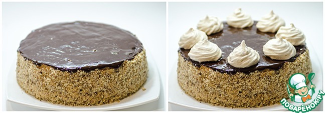 Теперь заливаем верх торта растопленным шоколадом, украшаем безе.