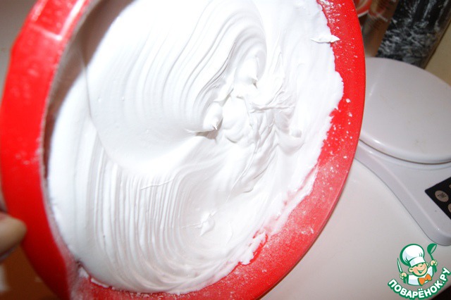 Продолжая взбивать постепенно, по одной ложке, ввести сахарную пудру 225 г и крахмал. Вот так выглядит правильно взбитое безе.