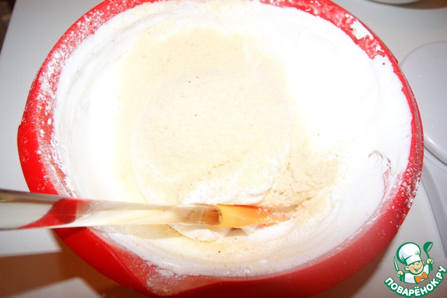 Каждый раз перемешивая лопаточкой методом складывания снизу вверх и по кругу.