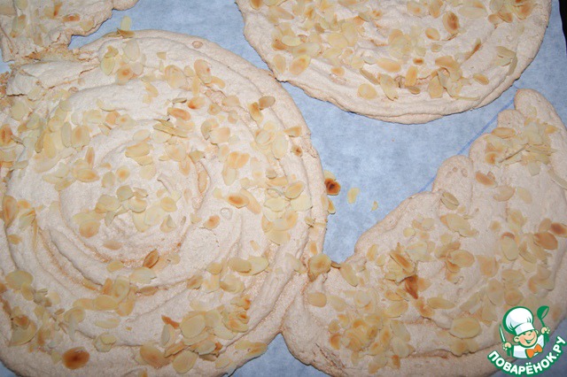 Поместить тесто в кулинарный пакет или шприц с насадкой 0,6 см в диаметре и начиная с центра отсадить спиралевидные коржи, посыпать их сверху миндальными лепестками.
