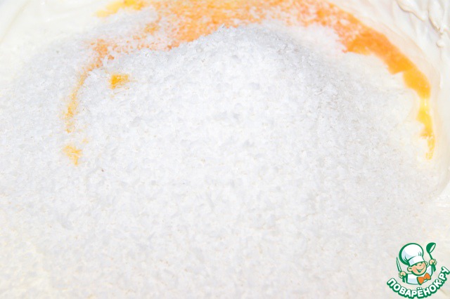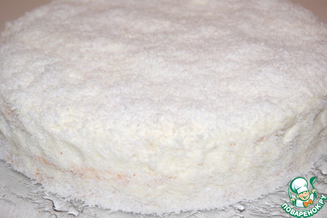 Сливки взбить до устойчивых пиков. Маскарпоне взбить с сахарной пудрой. Соединить все вместе, добавить кокосовую стружку 110 г и ликер, взбить на малой скорости миксера до однородности.