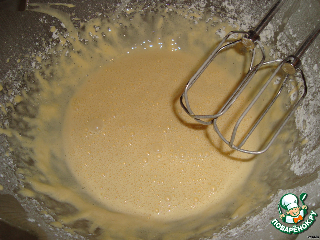 Безе готов ,остывает .Займемся бисквитом .Желтки взбиваем с сахаром пока масса не побелеет и не увеличится в объеме .Добавляем муку и крахмал .Соду я не добавляю т к предпочитаю с безе плотный бисквит.Вы можете добавить о.5 ложек гашеной соды. Белки взбиваем отдельно и вводим белковую пену в тесто .Тот же противень на которым выпекали безе застилаем пекарской промасленной бумагой .Выливаем тесто и ставим в разогретую до 180ти градусов духовку на 13-15 минут