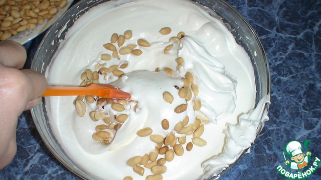 Частями всыпаем арахис и вмешиваем лoпаткой до равномерного распределения.