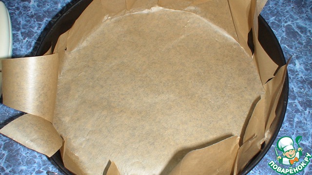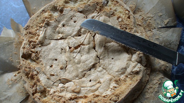 Форму по диаметру, как и бисквит, выстелить бумагой для выпечки, выложить белки. В разогретый духовой шкаф до t=200 С, держим 3-5 минут и убавляем жар до 175-150 С, выпекаем до готовности (проверять лучинкой). Я в это раз допустила ошибку, начала сушить безе при 100 С, как это рекомендуют делать почти во всех рецептах, и получилось немого не то, корж не хрустел.